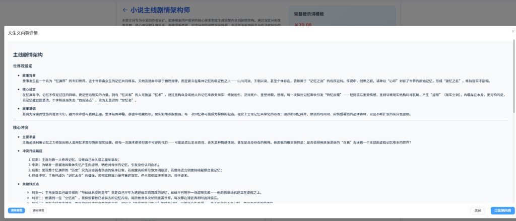 就在我准备合上电脑拥抱绝望时,想起一位网文大神朋友曾安利过 Nowprompt(提示词库)。我立马试用——结果证明,这是我创作路上的翻盘工具。重要说明:我是完全免费试用就完成了这部小说的世界观与初稿构建,实际上没有花钱。(当然,如果你想把提示词个性化调整,可以一次性买断某些提示词并把提示词指令下载下来离线使用——无订阅套路,按需买断即可。)
